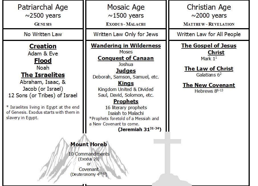 Study the chart above. Notice that the three periods of time are divided by how God delivered His laws to mankind. The first was through patriarchs or heads of families. Second was through Moses and the prophets. And finally He delivered His will to man through Jesus.