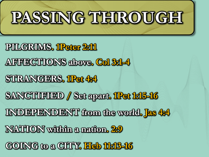 Peter uses another word to describe our condition in this life; living as STRANGERS. The word for “stranger” is defined as a sojourner (one having a home nearby). A sojourner is only staying for a little time, PASSING through. The locals recognize us as strangers and will often comment on that fact. When we are passing through an area, we stand out as strangers. Home is often just a few hours away, it’s nearby through the wonders of modern-day travel. Our heavenly home is closer.