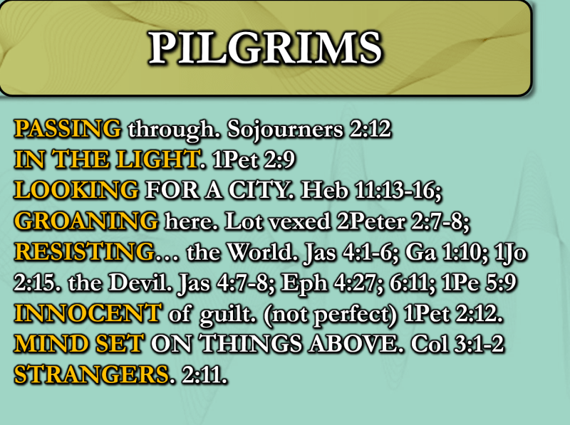 One word Peter uses to describe our situation is as PILGRIMS. Strong’s defines this as “an alien alongside, i.e. a resident foreigner.” This same word is used to describe the life of the heroes of faith listed in Hebrews 11:4-12. A resident foreigner is one who is living in a temporary place, but doesn’t put down any roots.