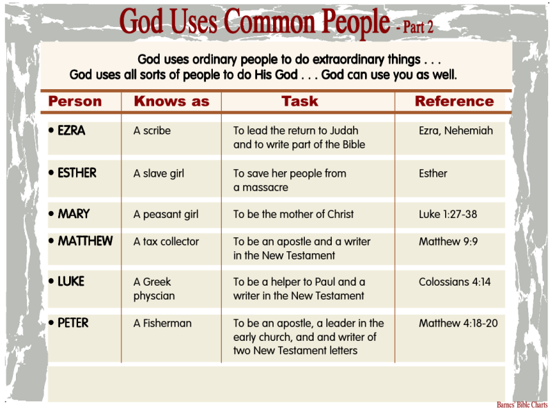 We can learn from Cain & Abel (Gen 4), Moses’ mistake at Meribah (Num 20), Solomon’s mistakes in the many women he had (1Kings 11:3). We can learn from Esther’s example of bravery, and her uncle’s example of doing what is right.