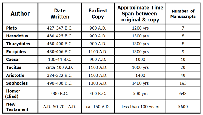 Authors such as PLATO (300-400 bc), Aristotle (384BC), and Homer (8th century BC), are accepted despite having very few surviving copies of their works. Homer’s Iliad has only 643 manuscripts. Aristotle only has 49 MSS. Plato only has 263 copies.