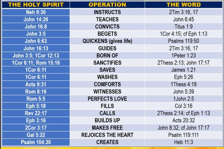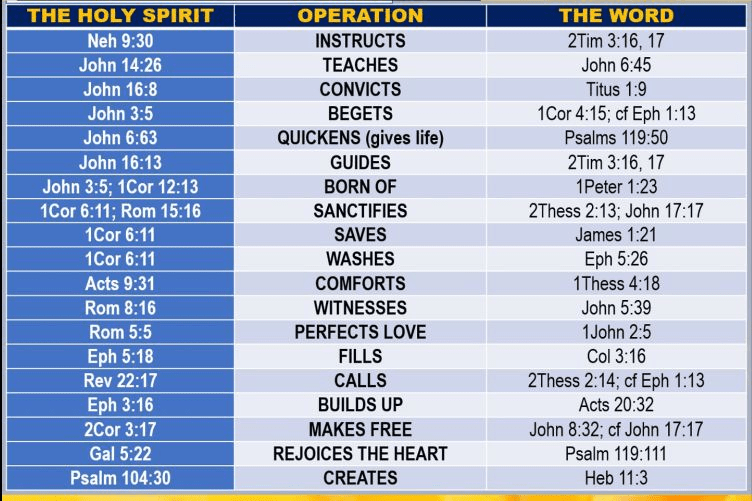 Give One Understanding (Psa.119:130). Build One Up And Give Inheritance Among The Sanctified (Acts 20:32). Keep One From Sinning (Psa. 1119:11; 1 John 2:1). Quicken One; Make Him Alive Spiritually (Psa. 119:50; Eph 2:1). Effect A Spiritual Begettal (1 Cor. 4:15). Consummate A Spiritual Birth (1 Pet. 1:23). Justify (Rom. 2:13). Produce Faith (Rom. 10:17). Guide (Psa. 173:24; 119:105) Produce Fruit (Luke 8:15 Col 1:5,6 Give Everlasting Life (John 4:14). Make One A Disciple Indeed (John 8:31). Cleanse (John 15:3; Eph. 5:26). Sanctify (John 17:17; Eph. 5:26). Purify The Soul (1 Pet. 1:22). Save The Soul (Jas. 1:21). Produce Spiritual Growth (1 Pet. 2:2). Effectually Work (1Thes. 2:13). Comfort (1thes. 4:18; Rom. 15:4). Rejoice The Heart (Psa. 119:111). Give Understanding (Psa. 119:104). Reconcile (2 Cor.5:17,18) Judge Us At The Last Day (John 12:47,48)