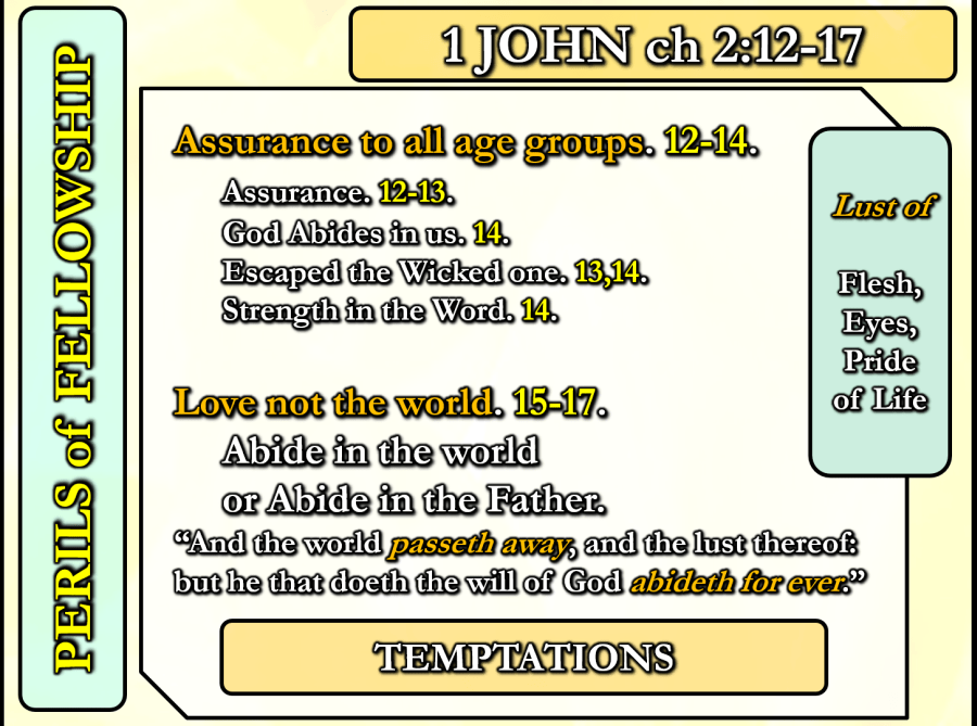 Assurance to all age groups. 12-14. Assurance. 12-13. God Abides in us. 14. Escaped the Wicked one. 13,14. Strength in the Word. 14.