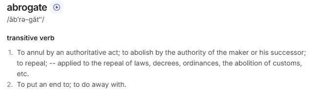 (Abrogated: To annul by an authoritative act; to abolish by the authority of the maker or his successor; To put an end to; to do away with.)